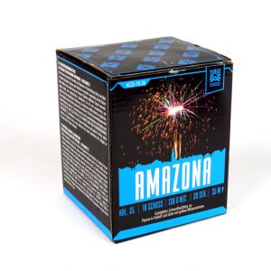 10 Schuss in 25mm. Argento Amazona. Goldglitter-Schweifaufstieg zu Päonie in Grün und Violett mit gelben Blütensternen.