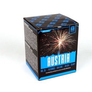 10 Schuss in 25mm. Argento Austria. 10 Schuss Batterie. Schweifaufstieg und Buketts aus roten und weißen Blinksternen.