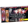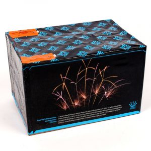 49 Schuss Feuerwerkskomposition Goya von Argento in variierender Fächerung, mit gemischten Effekten in Gold, Violett und Gelb.