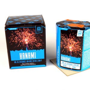 10 Schuss Batterie Hanami von Argento Feuerwerk im Kaliber 25mm. Blauer Leuchtspur-Aufstieg zu blauer Päonie mit roten Blütensternen.