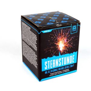 10 Schuss in 25mm. Argento Sternstunde. Titangold-Schweifaufstiege zu Titangoldweiden mit blauen Spitzen, kombiniert mit goldenen Blinksternen.