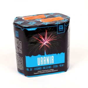 13 Schuss Batterie Urania von Argento im Kaliber 30mm. Violetter Titanschweif-Aufstieg zu violetter Titanpalme, kombiniert mit grünen und goldenen Blinksternen.
