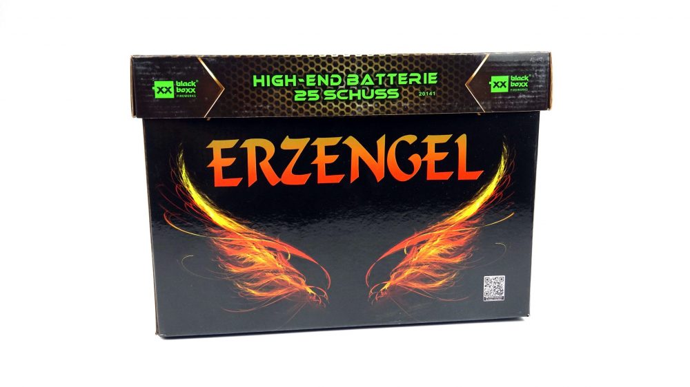 Blackboxx Erzengel. Große Titangoldweiden, kombiniert mit kräftigen Rotblinkern, sowie Titangoldweiden, kombiniert mit blauen Päonien. Die Effekte werden jeweils abwechselnd im 5er Fächer geschossen, immer mit Silberblinker-Feuertöpfen in der unteren Ebene.