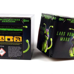 Der Lars vom Mars von Blackboxx ist eine 30mm Batterie mit 25 Schuss. Filigrane Goldflimmer-Palmen mit wechselnden Sternenbuketts in Rotblinker und Blau, untermalt von fetten Goldschweifkometen.