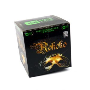 Blackboxx Rokoko. Titangold-Palmen mit Verwandlung zu silbernen Spitzen, darunter Feuertöpfe mit Verwandlung von Goldbrokat zu Silber, durchzogen von Goldflimmer-Schweifkometen.