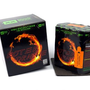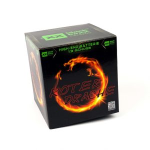 Blackboxx Roter Drache. Feuertöpfe in Rot- und Silberflimmer, darüber Buketts aus sanft knisternden Silberpalmen, kombiniert mit Rotblinkern und Silberblinkern.