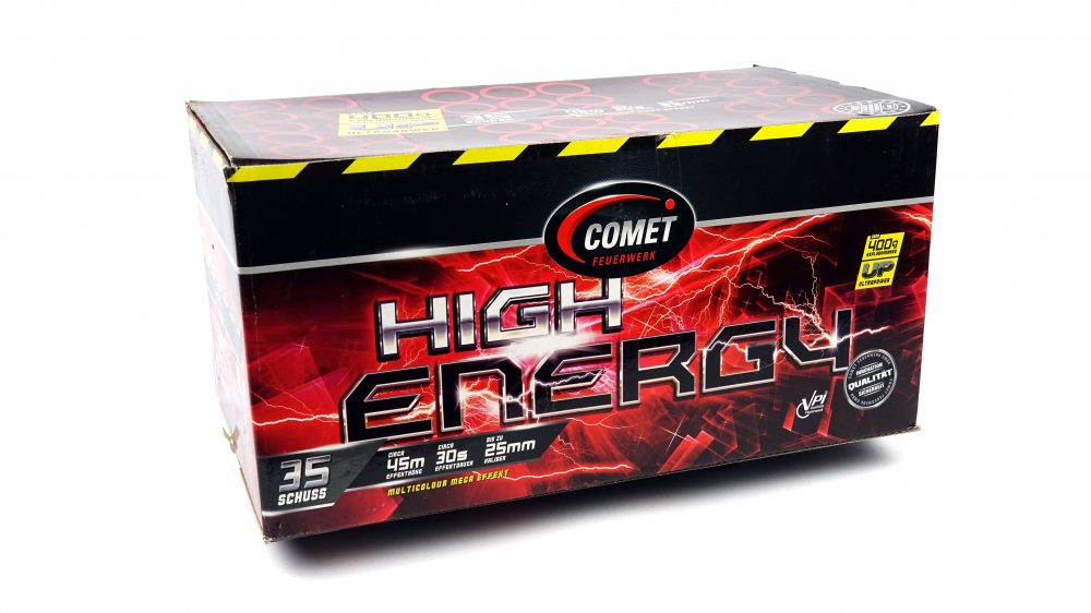 High Energy ist eine 35 Schuss W-Fächer Batterie von Comet Feuerwerk mit über 400g NEM.