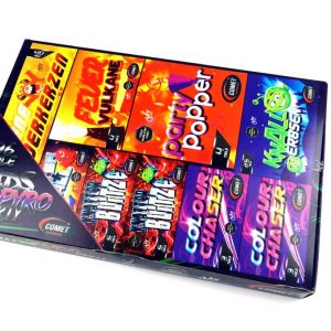 Das Jugendfeuerwerk Sortiment Kids Pyro Party von Comet hat 96 Einzelteile. Vom Vulkan bis zur Knallerbse ist alles dabei.