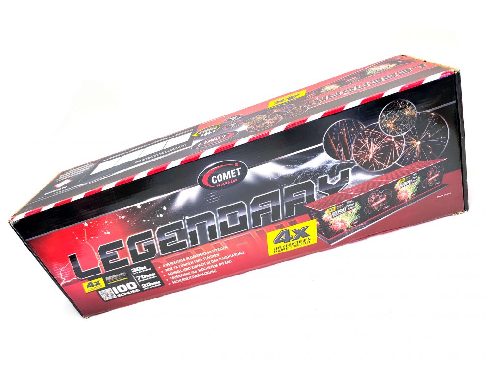 Legendary ist ein 100 Schuss Verbundbrett von Comet Feuerwerk mit ganz netten Effekten.
