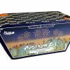 Die Dahliencracker F-1 von Funke. Gefächerte 36 Schuss Batterie im Kaliber 25mm. Salven von Feuertöpfen und Buketts aus Gold- und Silbercrackern, mit verschiedenfarbigen Dahliensternen und Crackerschweifaufstieg.