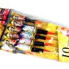 30mm Doppelschlag Batterie von Funke Fireworks. Zweifach geschossener Kometenaufstieg zu Brokatkrone mit Dahliensternen, abwechselnd in rot und grün.