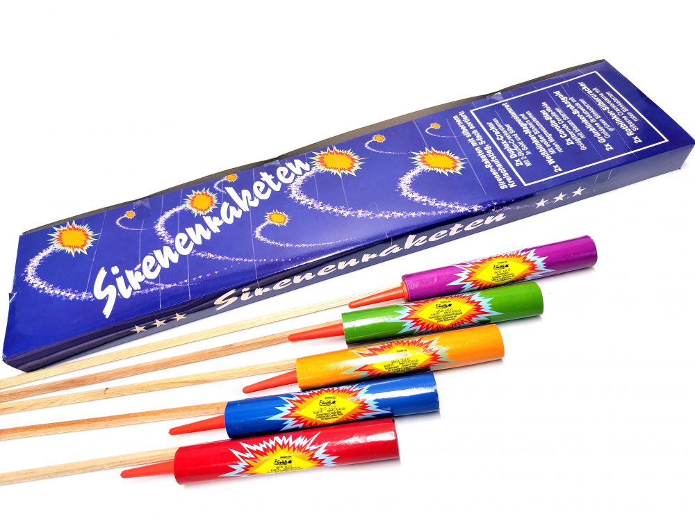10er Schachtel der wohl beliebtesten Raketen von Funke Fireworks, den Sirenenraketen. Extrem lauter Silberpfeifaufstieg zu fettem Bukett. Leider sehr teuer und es handelt sich um original verpackte Ware.