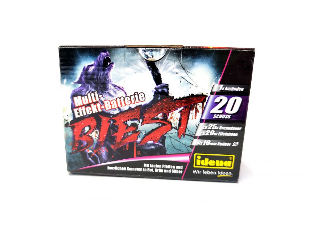 Die Beast ist eine 20 Schuss Batterie von Idena aus dem Hause Weco Feuerwerk. Leuchtkugeln und Zerlegerbuketts.
