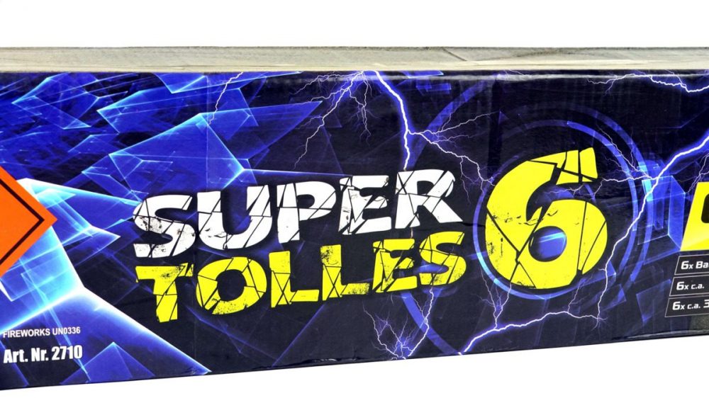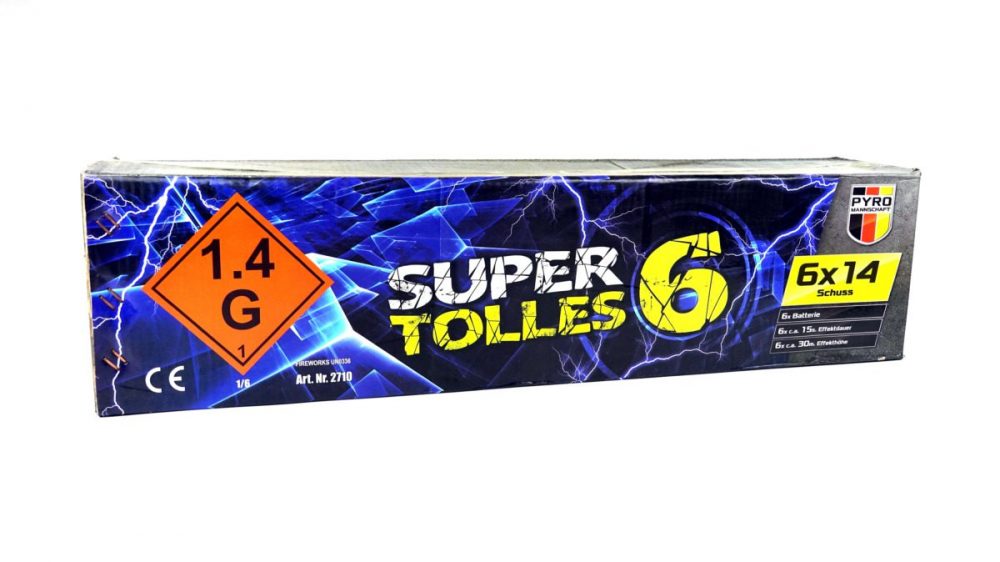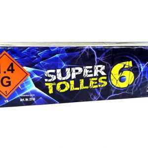 Verbundbrett Super Tolles 6 von Lesli mit 6 Batterien in einem Sortiment mit insgesamt 84 Schuss. Sehr schöne Palmen und Brokateffekte mit vielen Blinkern.