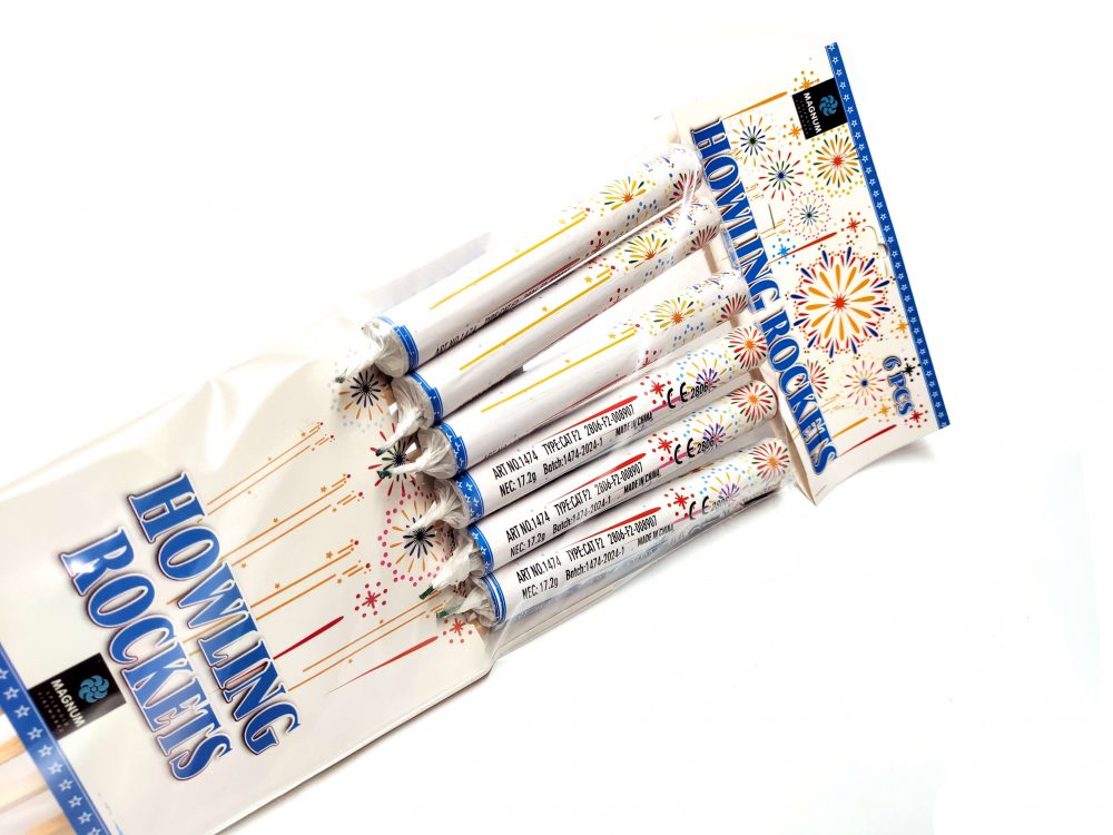 6er Packung Howling Rockets von Magnum Feuerwerk aus den Niederlanden. Extrem geiler Aufstieg zu gutem Bukett.