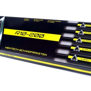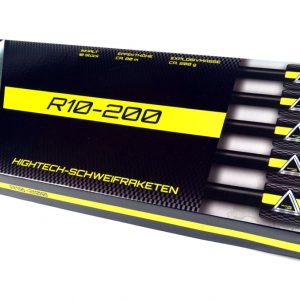 Nico Delta Fire R10-200. Hochwertiger Präsentkarton mit 10 großen Hightech-Schweifraketen mit maximaler Explosivmasse, 5-fach sortiert. Die Raketen steigen mit wunderschönem Silberschweif sehr hoch auf und zerlegen in einem lauten Knall zu riesigen Buketts mit einer ganz besonderen und abwechslungsreichen Effektauswahl. Neben dem Anzündstäbchen im Deckel sind folgende Raketen enthalten: