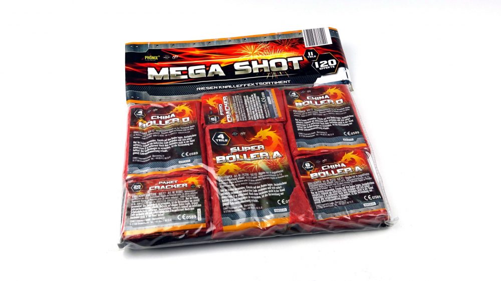 Großes Chinaböller Sortiment Mega Shot von Phönix Feuerwerk, alias Keller. Enthlten sind Super Böller, D-Böller und andere Größen.