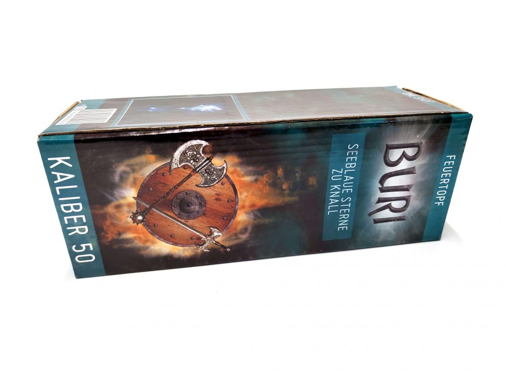 Der Buri ist ein fetter 50mm Feuertopf von Pyroart. Er feuert eine Wolke aus blauen Sternen und Titanknallern in den Nachthimmel.