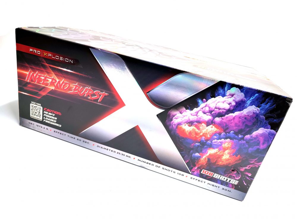 Neuer 108 Schuss Verbund von Pyromoravia, die Inferno Burst. 2000g Nettomasse werden mit den Kalibern 25 und 30mm vernichtet.