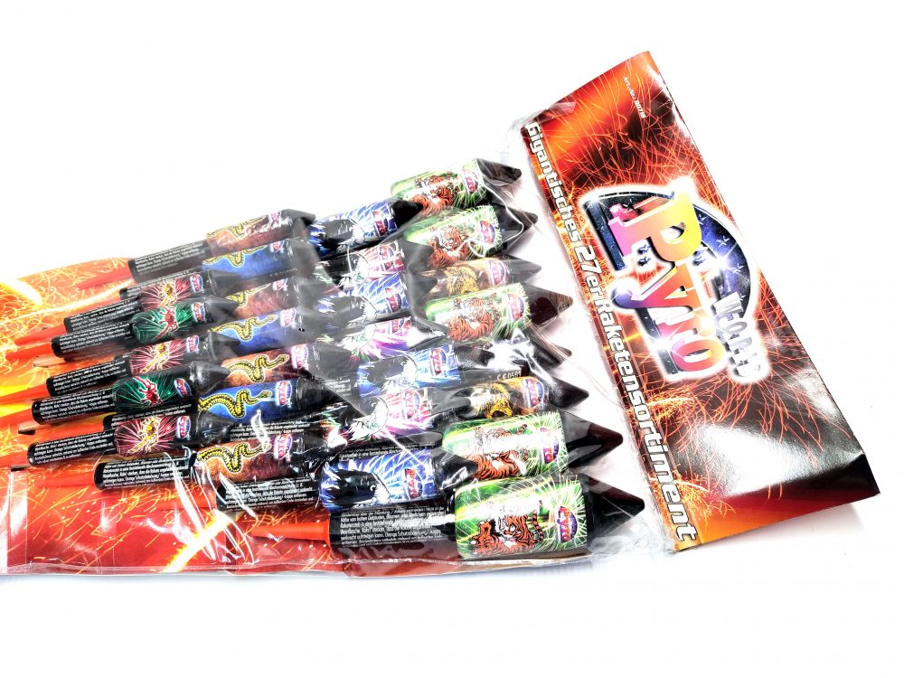Das Pyro World ist ein sehr großes Raketensortiment von Pyropartner aus dem Hause Nico Feuerwerk. Enthalten sind 27 Raketen mit Bombenfüllung und älterem Design.