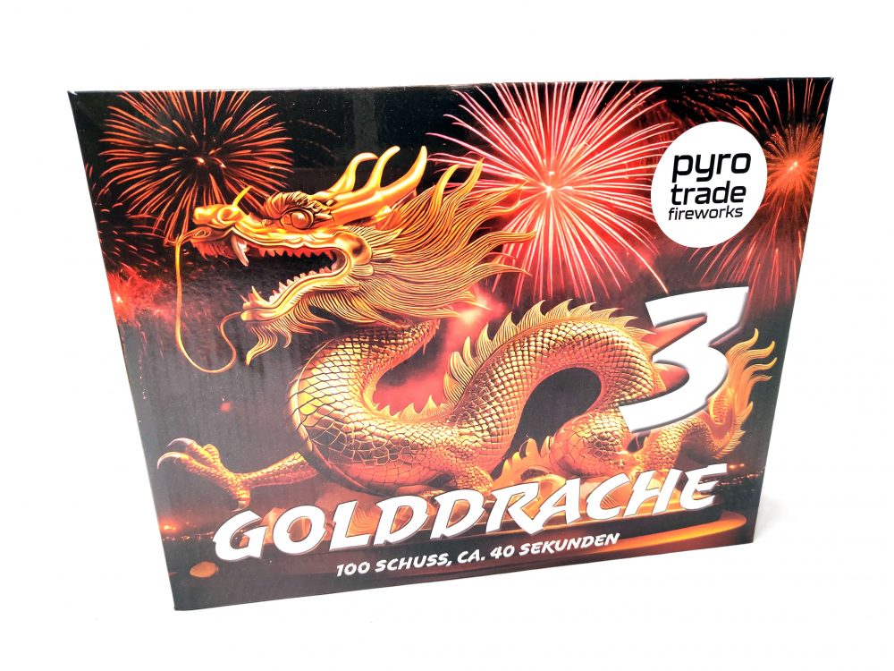 Der Golddrache 3 ist ein 100 Schuss Verbundbrett von Pyrotrade aus Österreich. Wundervolles Goldgebrezel!