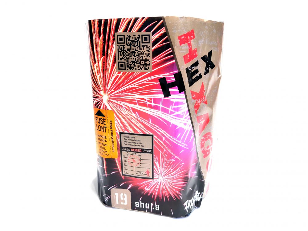 Die TB111 Hexagon ist eine sehr große 19 Schuss Batterie von Tropic Fireworks aus Polen im Kaliber 30mm. Goldglitter Weiden mit weißen und roten Blinkern.