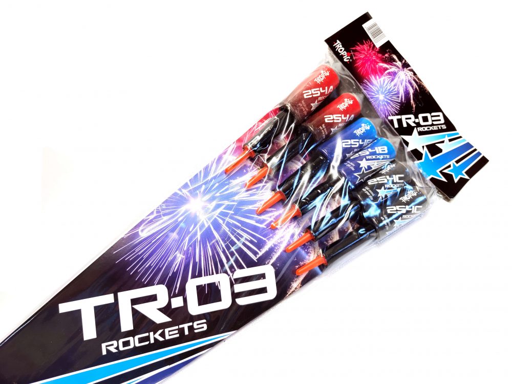 6er Raketensortiment TR03 von Tropic Fireworks aus Polen. Brokat Kronen mit roten Blinkern und Knisterweiden mit blauen Sternen. Müssen wir mal testen 🙂