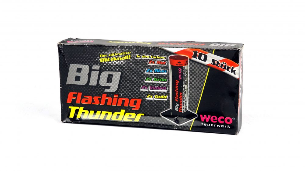 10er Schachtel Big Flashing Thunder Bombenrohre von Weco Feuerwerk. Farbiger Aufstieg zu lautstarkem Titansalut.