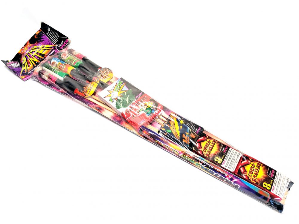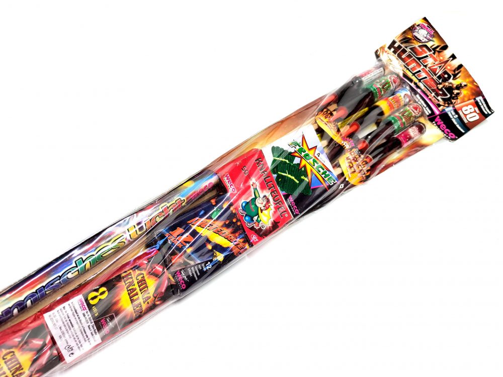 Star Hunter ist ein kleines Familiensortiment von Weco Feuerwerk. Enthalten sind 5 Raketen mit Schütt und Zerlegerladungen, Leuchtfeuerwerk, einige Knallartikel und Jugendfeuerwerk.